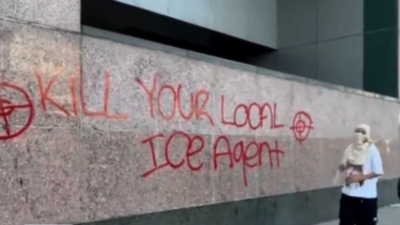Amid the sprawling crowds, an unidentified individual was witnessed spray-painting 'kill your local ICE agent' on the exterior of a federal facility near the civic center.