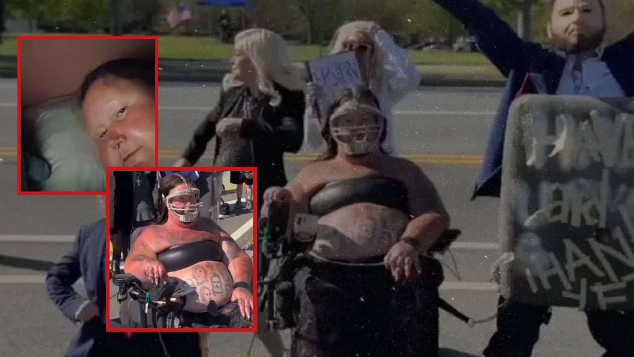 During the demonstration, the woman was photographed wearing a complex ensemble that included a Hannibal Lecter-style mask, a flotation device, heavy tattoos, and a septum piercing. She was observed participating in the event while utilizing a mobility scooter. Her image quickly became a focal point for political commentators, generating millions of views within a short timeframe.